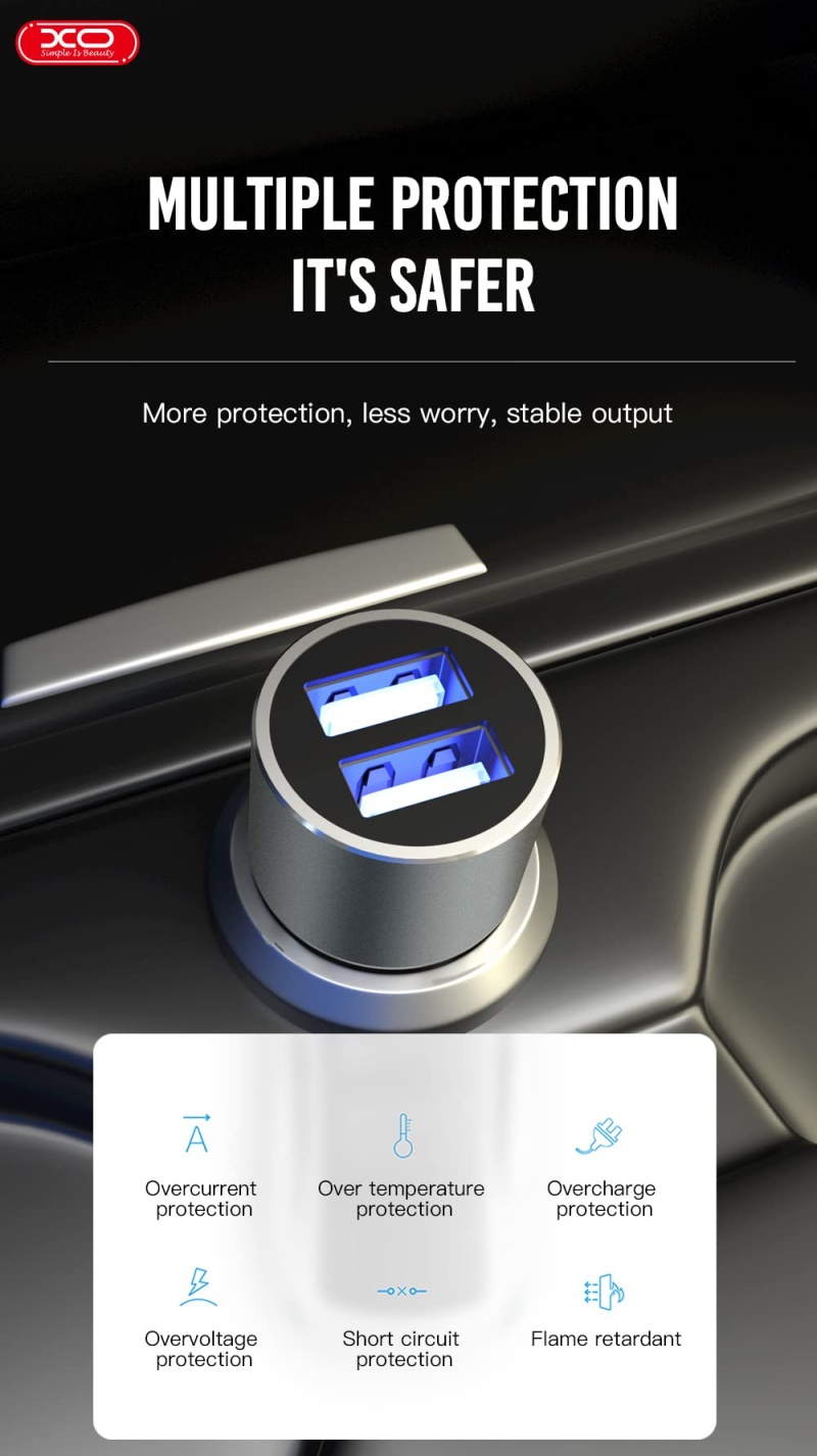 شاحن سيارة معدني من اكس او 2.4 امبير، لون رمادي، موديل CC30