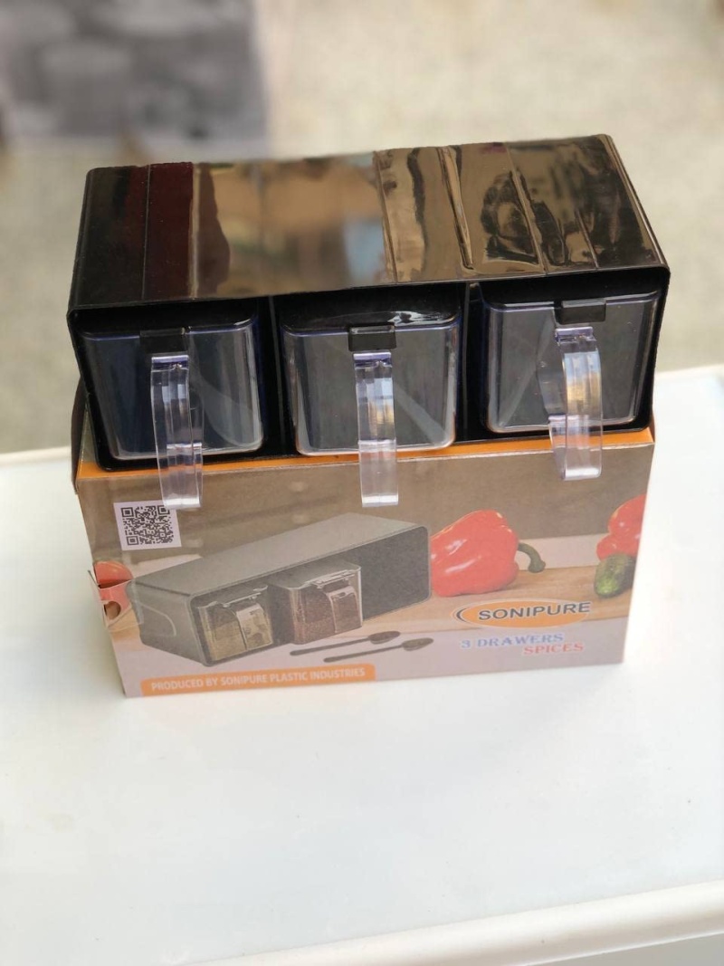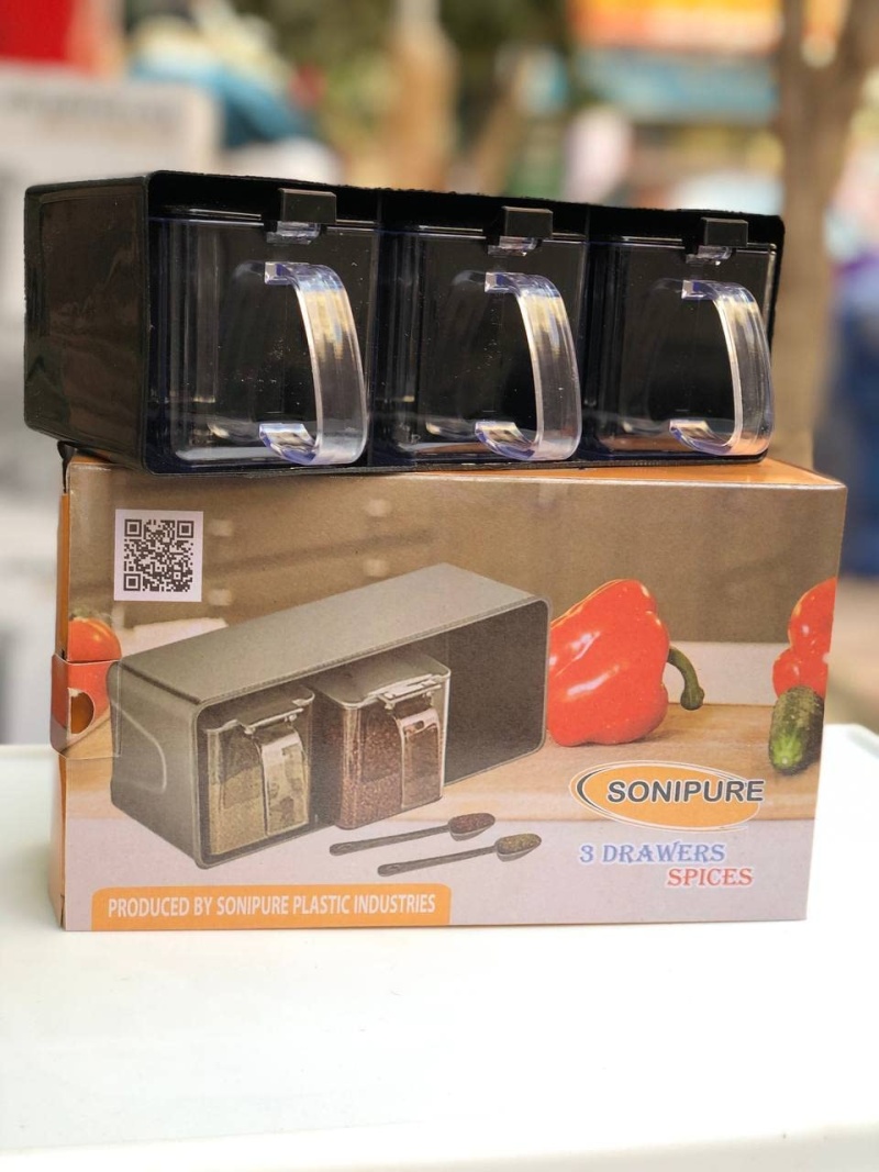 طقم توابل للمطبخ - مجموعة علب توابل أكريليك مكونة من 3 قطع مع معالق، 3 قطع بـ 3 معالق مع سباتولا، يمكنك استخدامها للتوابل أو السكر والشاي
